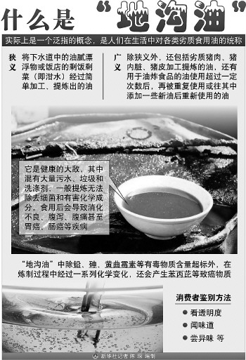 研究表明,長期攝入地溝油會對人體造成明顯傷害,如發(fā)育障礙、易患腸炎,并有肝、心和腎腫大以及脂肪肝等病變。而地溝油中的主要危害物之一黃曲霉素是一種強烈的致癌物質(zhì),其毒性是砒霜的100倍。另一個問題是倫理上的,別人吃過的油,在下水道里變質(zhì),再撈上來,你能吃得下去嗎? 那么,有沒有一種簡便的方法,可以鑒別地溝油呢?我們不妨聽聽食品科學專家和業(yè)內(nèi)人士怎么說。 1、科學鑒別地溝油 目前沒有好辦法 在一個注重食品安全的時代,理想的狀態(tài)是,你下館子,隨手掏出一張試紙浸到菜里,過一會兒拿出來跟譜表比比,然后大叫:“掌柜的,換油!” 2、傳統(tǒng)的檢測方法 都有一定局限性 在科研工作者看來,治理地溝油的難點在于,經(jīng)過洗滌、蒸餾、脫色、脫臭等精煉過程后,單從外觀和感官上,很難區(qū)分地溝油和普通油。不法商販還會把地溝油摻入食用油中,如果含量較少,更是難以檢測。 3、鑒別地溝油 冰箱顯身手? 曾在北京多家大酒樓擔任總廚、高管的特級廚師馮鵬說,一般情況下,地溝油和普通油無法區(qū)分,進貨時難免上當。他只能通過實踐來判斷:飯館炒菜之前一般要先過油,在這道“滑油”工序中,好油可反復(fù)使用七八次,而地溝油最多使用三次就會變黏,而且有哈喇味兒。 “另外,室外溫度較低時,地溝油會像棕櫚油一樣凝固,所以常有人用地溝油冒充棕櫚油!瘪T鵬說,冬天可以據(jù)此鑒別地溝油,夏天則可通過冰箱來檢驗。一些媒體認為地溝油有味道,可以聞出來,此外里面含水多,下鍋會爆響,馮鵬認為這些都是無稽之談,因為水根本摻不進油中,且地溝油也沒什么異味。 4、我們該如何 鑒別地溝油? 一看?赐该鞫,純凈的植物油呈透明狀,在生產(chǎn)過程中由于混入了堿脂、蠟質(zhì)、雜質(zhì)等物,透明度會下降;看色澤,純凈的油為無色,在生產(chǎn)過程中由于油料中的色素溶于油中,油才會帶色;看沉淀物,其主要成分是雜質(zhì)。 二聞。每種油都有各自獨特的氣味?梢栽谑终粕系我粌傻斡,雙手合攏摩擦,發(fā)熱時仔細聞其氣味。有異味的油,說明質(zhì)量有問題,有臭味的很可能就是地溝油;若有礦物油的氣味更不能買。 三嘗。用筷子取一滴油,仔細品嘗其味道。口感帶酸味的油是不合格產(chǎn)品,有焦苦味的油已發(fā)生酸敗,有異味的油可能是地溝油。 四聽。取油層底部的油一兩滴,涂在易燃的紙片上,點燃并聽其響聲。燃燒正常無響聲的是合格產(chǎn)品;燃燒不正常且發(fā)出“吱吱”聲音的,水分超標,是不合格產(chǎn)品;燃燒時發(fā)出“噼啪”爆炸聲,表明油的含水量嚴重超標,而且有可能是摻假產(chǎn)品,絕對不能購買。 五問。問商家的進貨渠道,必要時索要進貨發(fā)票或查看當?shù)厥称沸l(wèi)生監(jiān)督部門抽樣檢測報告。 |