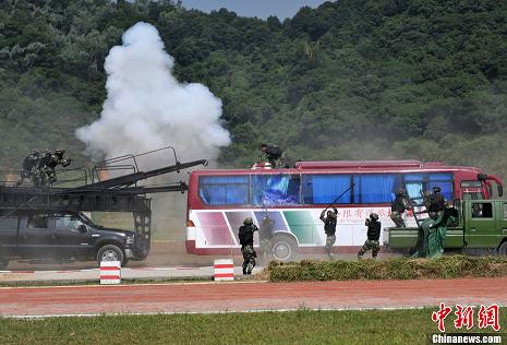 作為亞運安保主力的武警廣東總隊官兵,連日來在某訓練基地進行演練。為應對恐怖事件,該總隊強化了體能、攀登、擒敵、射擊、偵查、野外生存等訓練,并邀請反恐專家研究處置策略和戰(zhàn)術手段。
