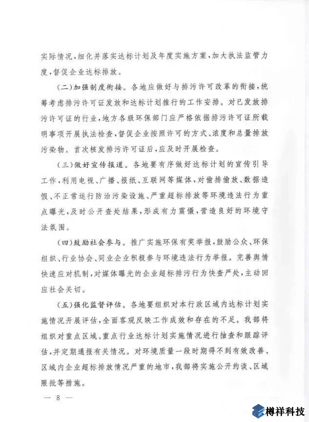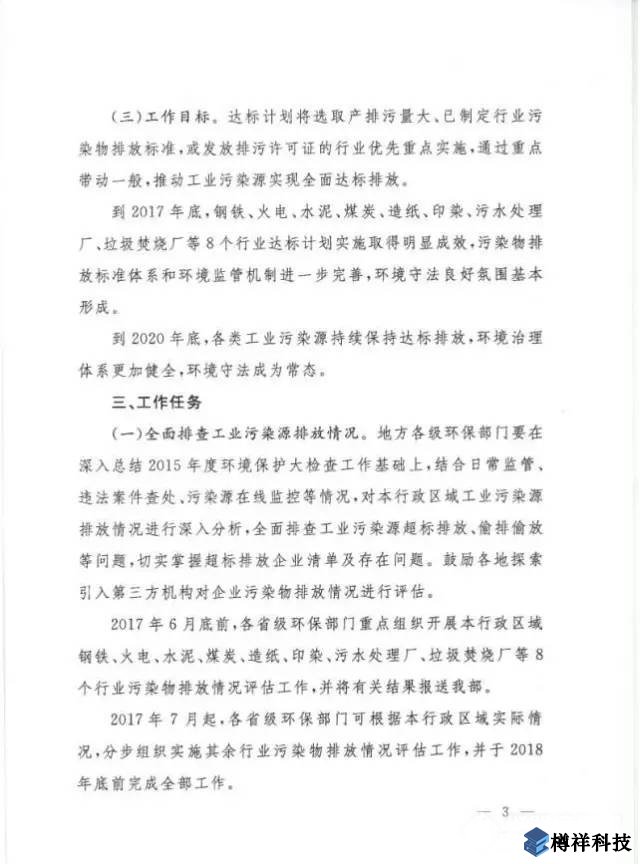 環(huán)境保護部日前發(fā)布《關(guān)于實施工業(yè)污染源全面達標排放計劃的通知》(以下簡稱《通知》),要求到2017年底,鋼鐵、火電、水泥、煤炭、造紙、印染、污水處理廠、垃圾焚燒廠等8個行業(yè)達標計劃實施取得明顯成效,污染物排放標準體系和環(huán)境監(jiān)管機制進一步完善,環(huán)境守法良好氛圍基本形成。到2020年底,各類工業(yè)污染源持續(xù)保持達標排放,環(huán)境治理體系更加健全,環(huán)境守法成為常態(tài)。