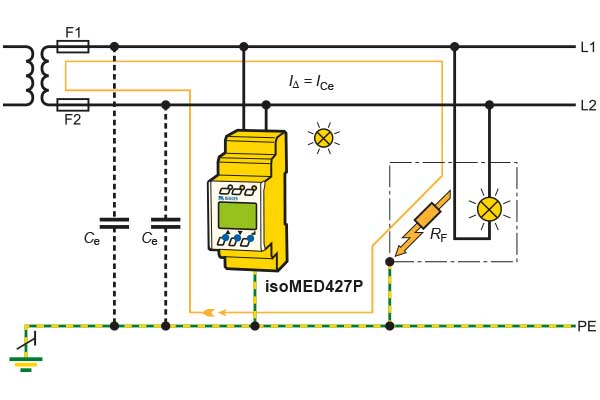 例如:如果在完整的不接地交流230 V系統且系統有足夠的小系統泄漏電容,當人接觸到帶電的導電外殼,他/她將遭受電擊。在這樣的條件下,只有很小的電流未被察覺才能從人的身上流過。接觸電壓主要是由連接在外殼上的保護接地線所產生的故障電流的電壓下降確定的。因為故障電流(由絕緣電阻和系統泄漏電容確定) 通常很小,而且保護接地線的電阻也很小,不會發生***接觸電壓。