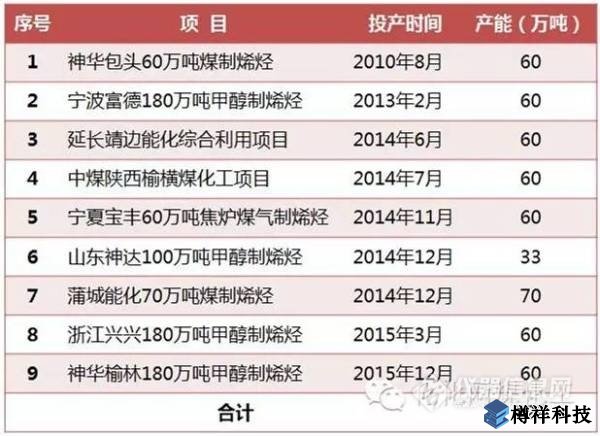 2015年底第九套神華榆林年產(chǎn)180萬噸甲醇制取年產(chǎn)60萬噸烯烴DMTO裝置投產(chǎn)