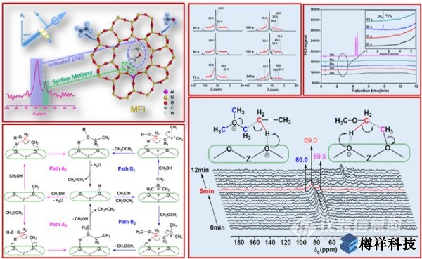 本項工作中,研究人員通過在線監(jiān)測***初始反應(yīng)階段,推測初始烯烴來源于催化劑表面C1吸附物種的直接轉(zhuǎn)化;隨后通過催化劑液氮淬冷和固體核磁表征,確定了催化劑上***初始反應(yīng)階段存在的表面C1吸附物種(甲醇和二甲醚)和C1活性物種(表面甲氧基和三甲基氧鎓離子);進一步通過原位固體核磁研究,在真實甲醇轉(zhuǎn)化反應(yīng)條件下,成功捕捉到二甲醚C-H鍵活化后生成的類亞甲氧基(methyleneoxy analogue)物種,由此獲取了C1物種活化生成***個C-C鍵的直接證據(jù);在此基礎(chǔ)上提出了初始烯烴生成的反應(yīng)路徑—表面甲氧基/三甲基氧鎓離子協(xié)助甲醇/二甲醚活化轉(zhuǎn)化的協(xié)同反應(yīng)機理。
