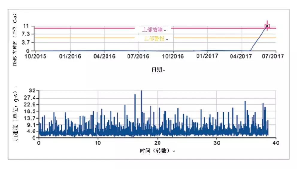 但這些沖擊是隨機的,有些可能會大到32 G-s。還請注意,在圖表中,沖擊突然開始達到***報警故障水平。這表明潤滑不足。